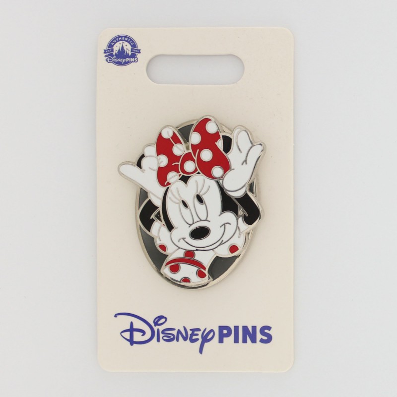 Disney Parks pin. Features Minnie in white and red polka dot dress. She is adjusting her headbow.